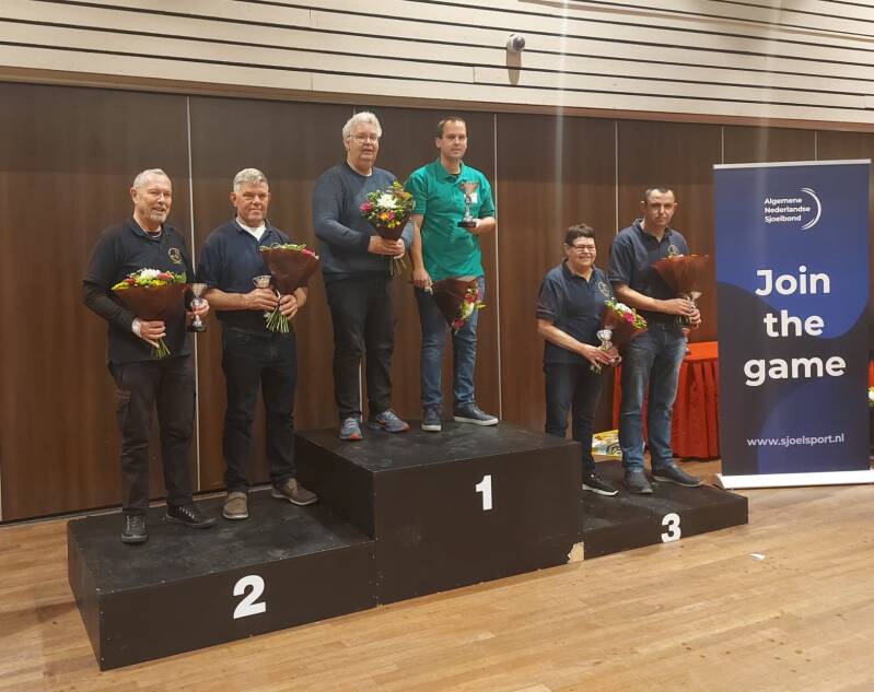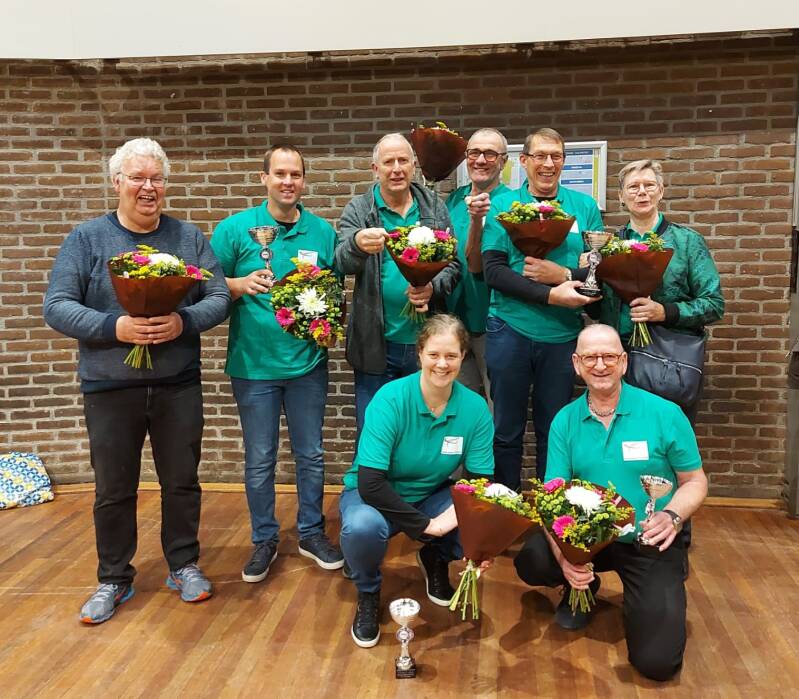 Op de foto de winnaars van het NK Koppelen op 19 november 2022, staand: v.l.n.r. Leo van Tiem, Tim van Tiem, Sjaak Siebeling, Theo van Leijden, Hans van Leeuwen en Marja Springin'tveld. Gehurkt Karin Dijkstra en Wijnand Springin'tveld.