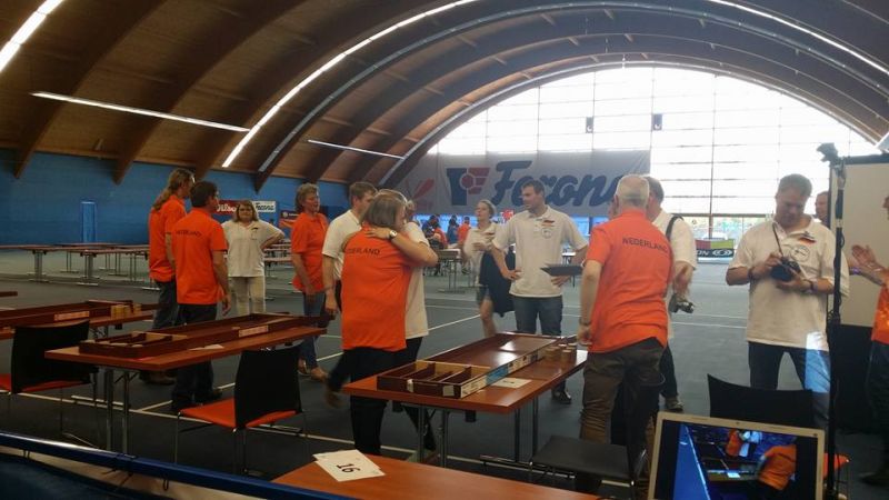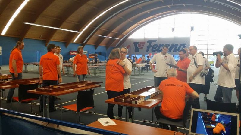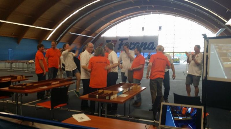 Nederland WERELDKAMPIOEN TEAMS met daarin Cock Tukker en Patrick Haring van sjoelclub Aalsmeer, samen met Geesje van der Linde, Nelly Eekhof en Bert Jan Wallaard.