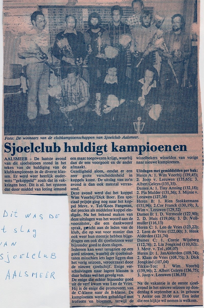 SA -69- (Politiek over sjoelen - historie – Klazienaveen – Top 10 Dames en Heren Je komt steeds iets