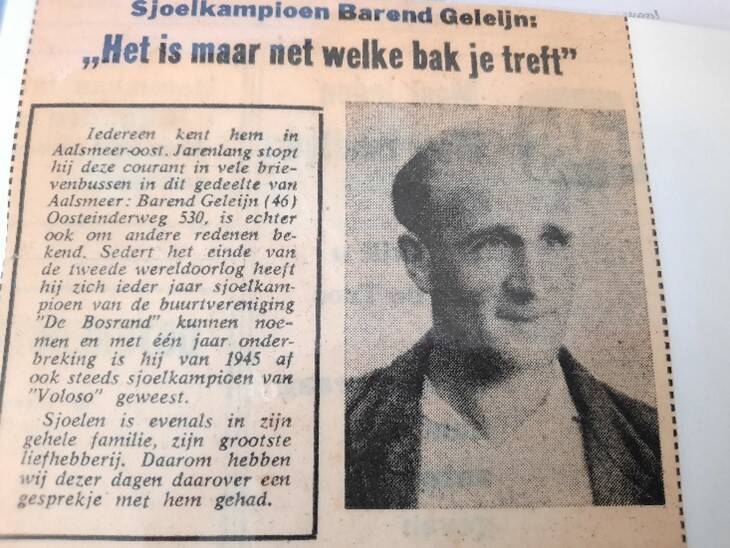 Vanaf 1945 tot 1964 is Barend Geleijn zonder onderbreking sjoelkampioen geweest van de buurtvereniging “De Bosrand” en tevens met slechts één jaar onderbreking ook steeds sjoelkampioen van “Veloso”. Veel verenigingen in Aalsmeer-Oost vooral en ook in andere gemeenten in Nederland, hadden naast hun bezigheden als voetbal, korfbal e.a. ook vaak enkele sjoelbakken staan. Tegenwoordig zie je Dart-borden.
