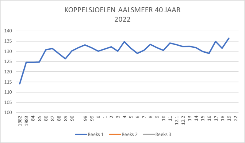 In 1982 was het de eerste keer koppelen. De winnaars behaalden 114,20 punten (Deen Broos en Wagtmans). In die 40 jaar is het gemiddelde van de winnaars snel gegroeid. In 1986 was dit al 130,77 en in 2019 was de hoogste score ooit met 136,47 punten. (Tim van Sommeren en Ronald Polman). Op bovenstaande grafiek is het verloop van de winnaars scores te zien. Na 1987 kwam het gemiddelde van de winnaars nog slechts vier keer onder die 130 punten gemiddeld. Het geeft aan hoe sterk de bezetting van het deelnemersveld steeds is. Ideaal is het moment zo vlak voor de NK-Koppelen. Iedereen wil dan nog wel even “aan de bak”.